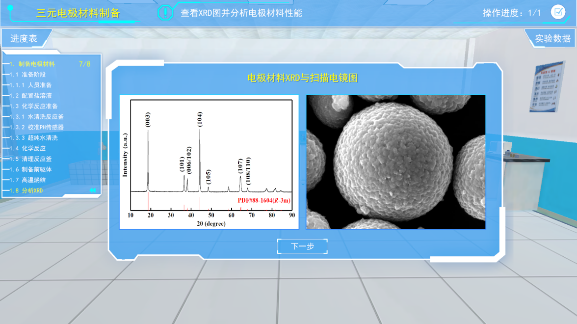 2)左侧实验进度表面板,其中列出了当前实验的主要操作步骤和流程,并对当前操作步骤进行指示,已经执行的步骤以白色字体显示,未执行的步骤以黄色字体显示。