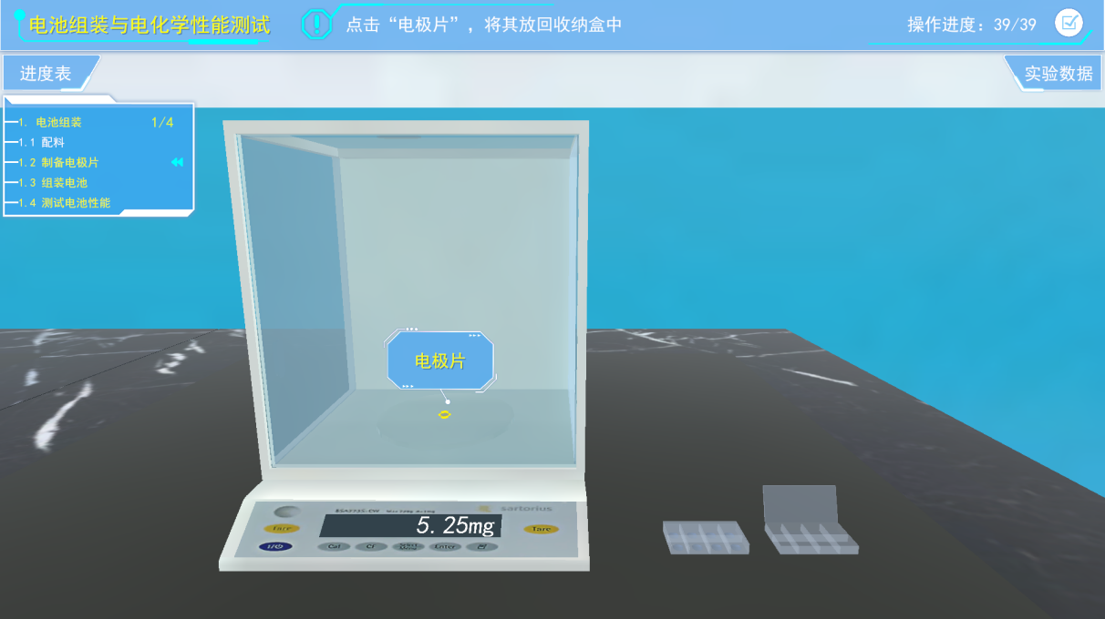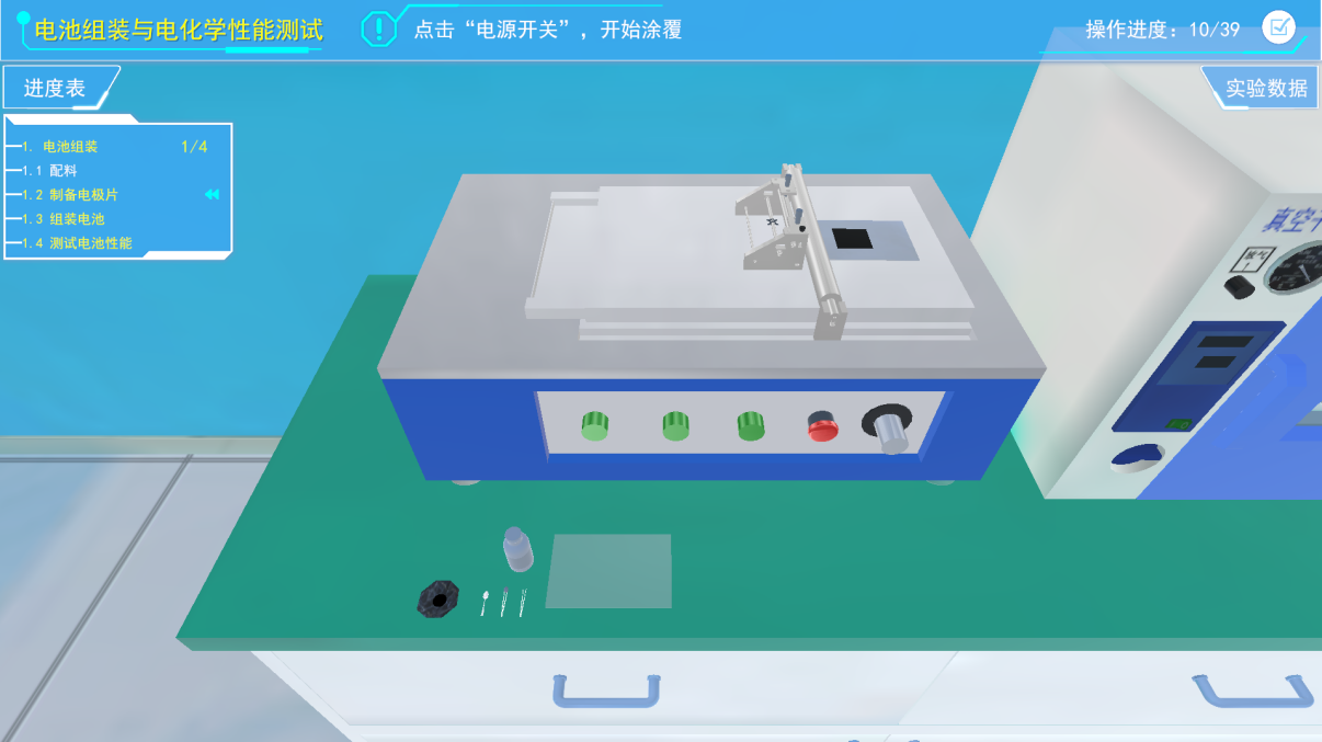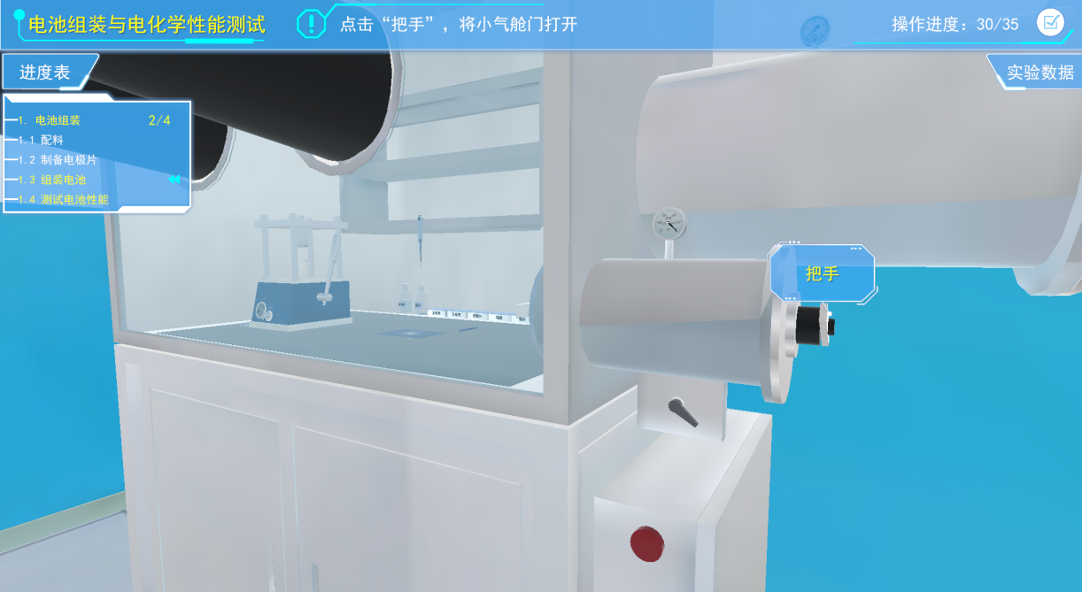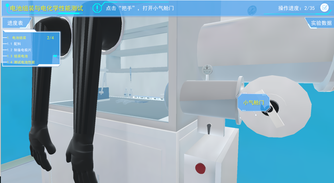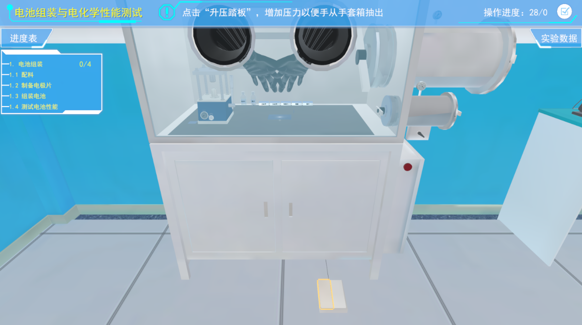 利用降压踏板对手套箱进行减压,然后将手伸入手套箱中,点击手套箱内部的把手,打开舱门,将电极片从小舱室取出。然后点击半透明手套,将其带在长手套上,将硫酸纸平铺在组装位置