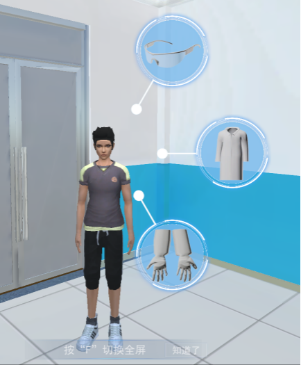 穿戴防护装备,点击“开始穿戴”,然后依次点击护目镜、手套、白大褂三个按钮,给场景中点虚拟人物设置相关防护装备;