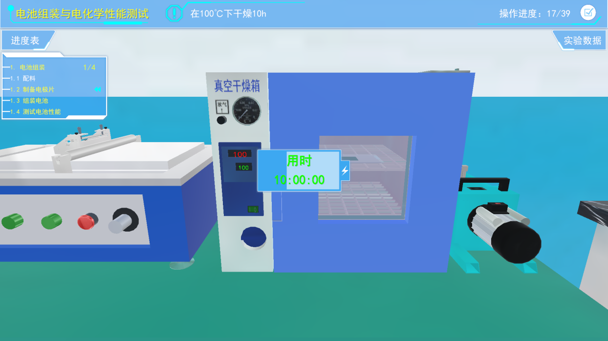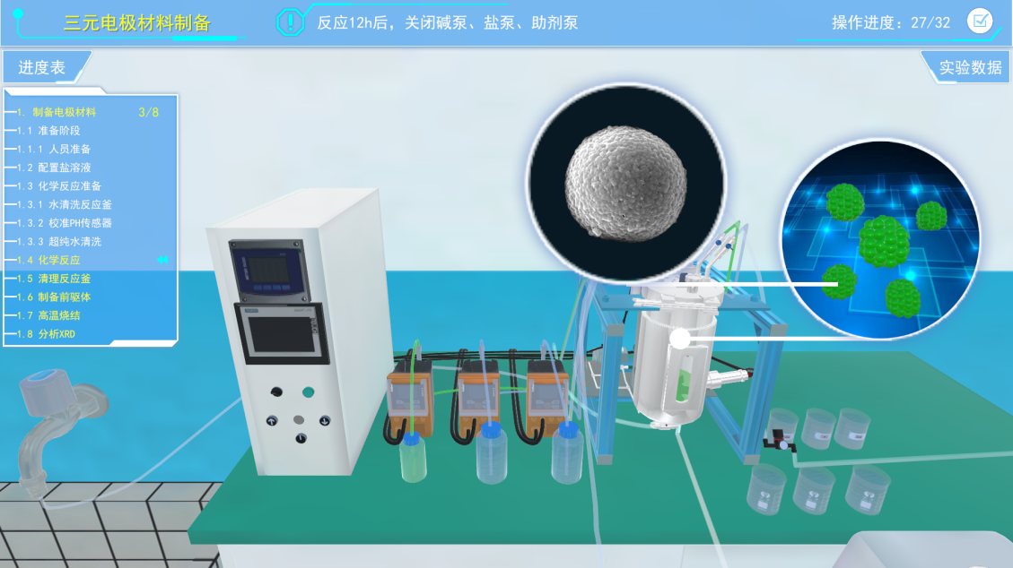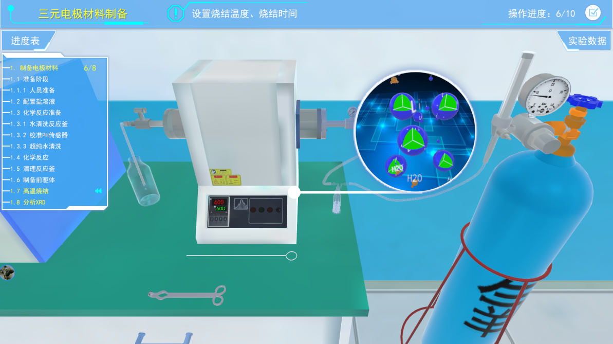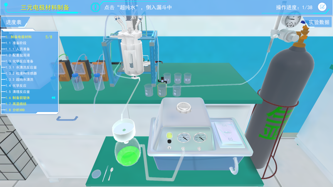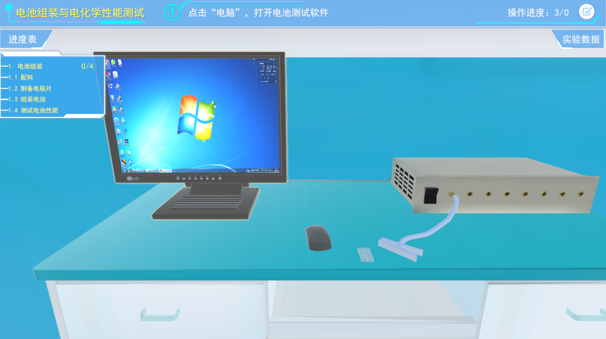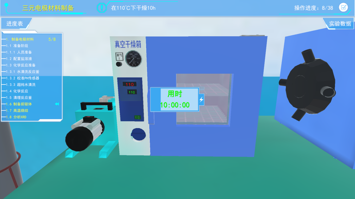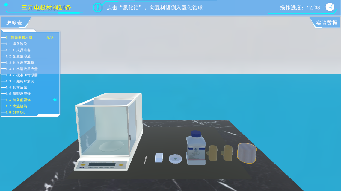 4)中间三维虚拟场景展示区域,进行虚拟实验操作和交互的主要区域,其中包含了虚拟的实验环境、仪器设备、材料耗材以及虚拟人物等。