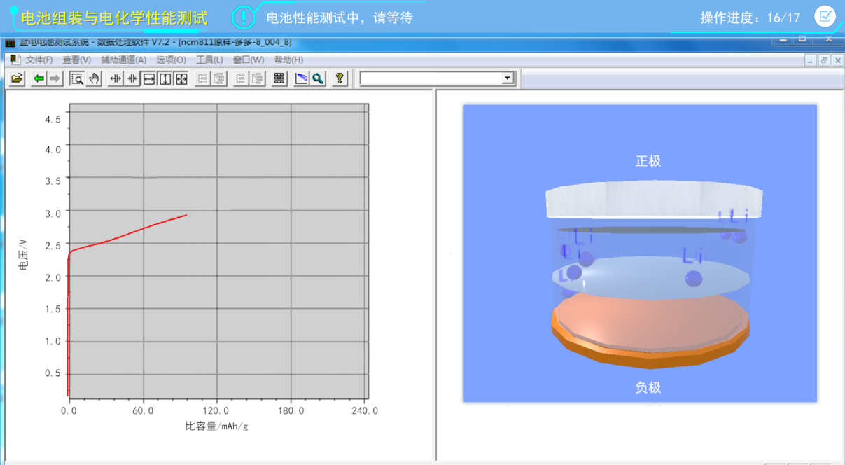 点击“当前测试程序”,设置充放电电流电压,随后关闭并退出监控软件。然后右键选择“活性物质参数”,输入活性物质的质量,设置循环统计方式。开始充放电测试,查看第一圈充放电曲线。