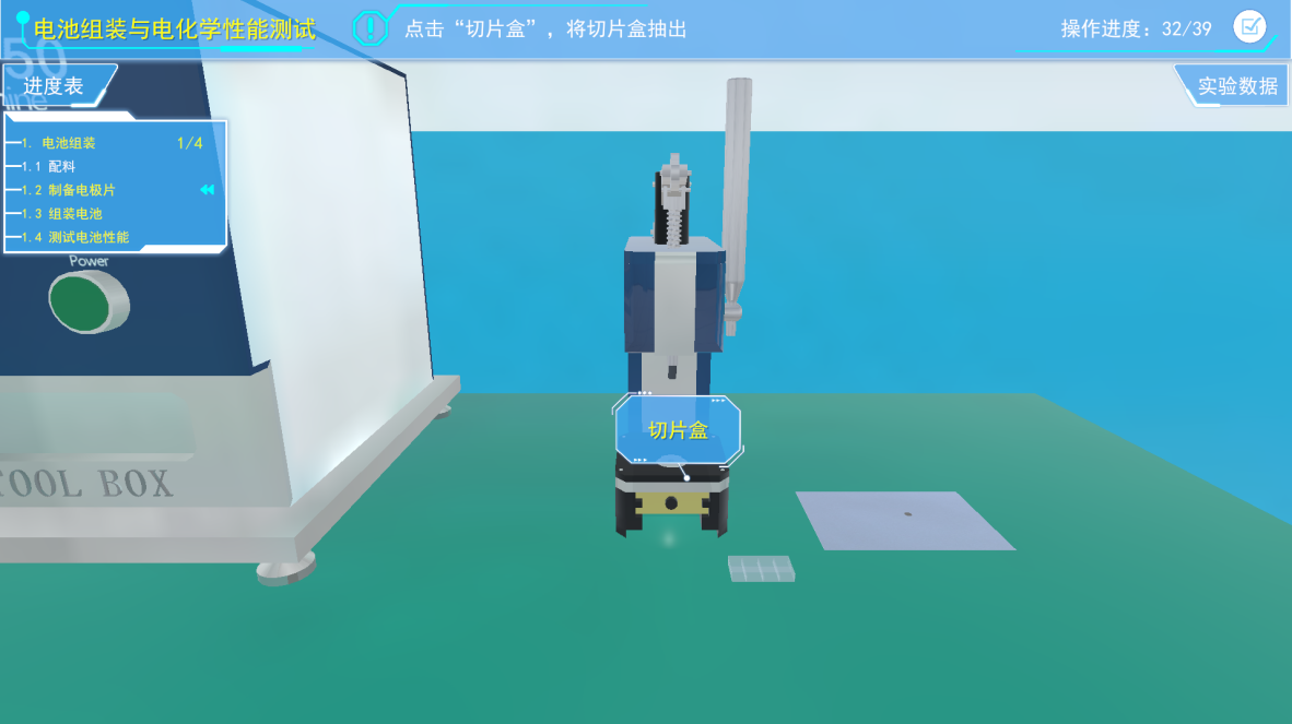 将箔片放到切片机上,然后搬动切片机手柄,进行切片。从切片盒中取出电极片并放入到收纳盒中。