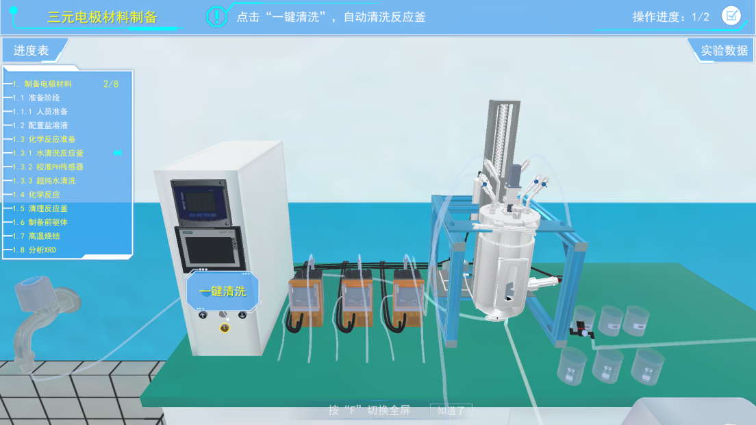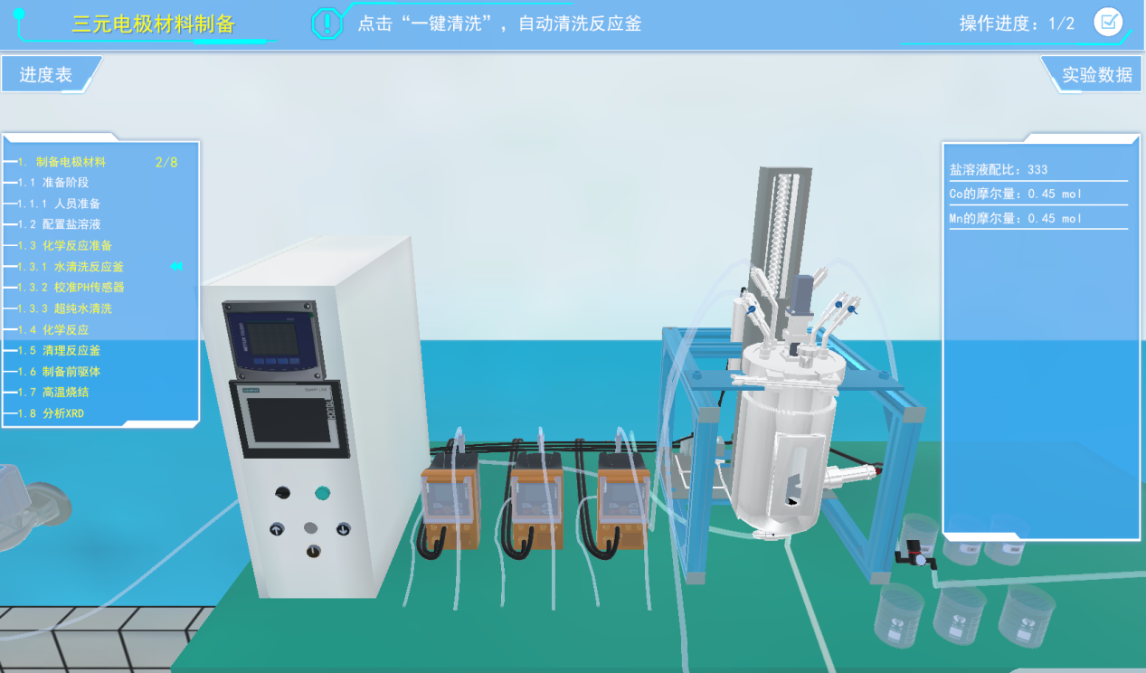 水清洗反应釜,点击系统中的“一键清洗”按钮,对反应釜进行20分钟的清洗操作(软件自动完成注水、清洗、排水等操作)