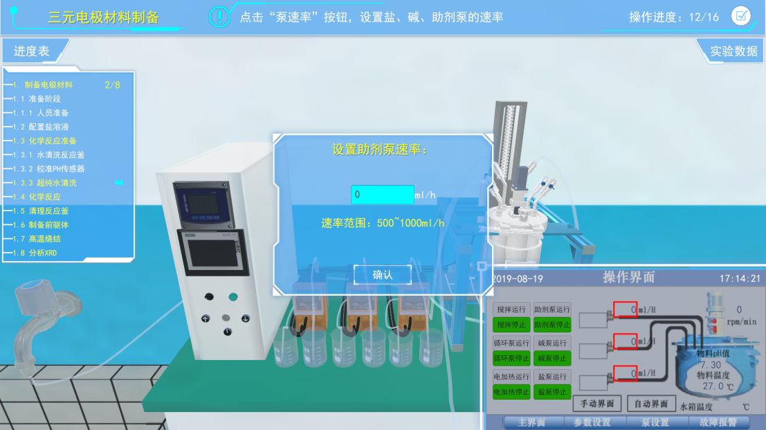 在虚拟软件上打开“参数设置”面板,对PH、冷却温度等参数进行设置后,返回界面并进行设置泵的速率,然后开始反应。