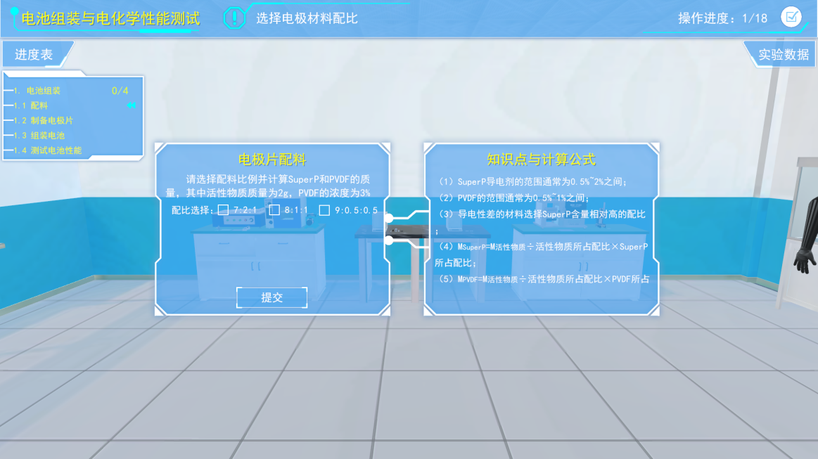 电极片配比,选择电极片的配比,并根据软件给出的知识点与计算公式,计算SuperP粉末的质量和PVDF溶液的体积。