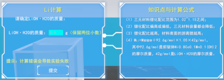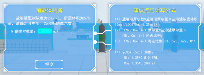 确定配比、计算摩尔数,前驱体制作,软件给出了前驱体配制的相关知识点与计算公式,学生可根据提示确定盐溶液配比,计算盐溶液配比浓度为2mo/L,所需体积为675ml的情况下的Ni、Co和Mn的摩尔数。