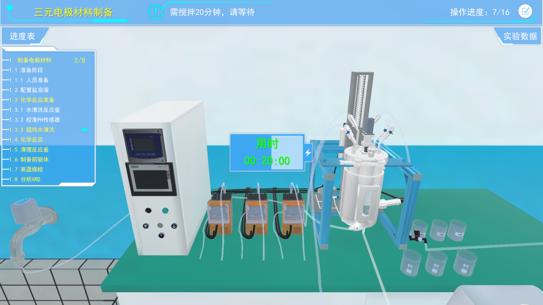 超纯水清洗反应釜,打开虚拟反应釜顶盖上的密封环,然后抬升反应釜顶盖,并倒入超纯水,降下顶盖并关闭密封环。在虚拟软件界面上完成开始搅拌,执行20分钟后,停止搅拌,并将废水排除。