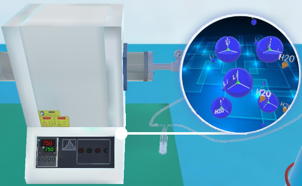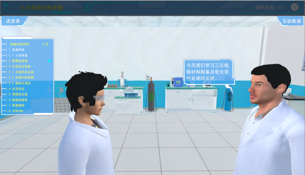 学生在开展实验前可通过教师指导的真实实验或现场视频等方式,初步认知实际生产环境和整个工艺过程。该虚拟环境中分别构建“共沉淀反应制备前驱体”、“高温锂化制备电极材料”、“电极片制备”、“扣式电池组装”和“电化学性能测试”等关键虚拟仿真环节,还对实验操作过程中如平衡物料计算理论、仪器操作、问题分析等进行规范指导,并设置“工艺工程师”和“加工操作员”两个虚拟人物,其模拟生产交互环节和情景对话。