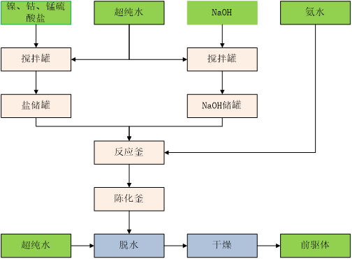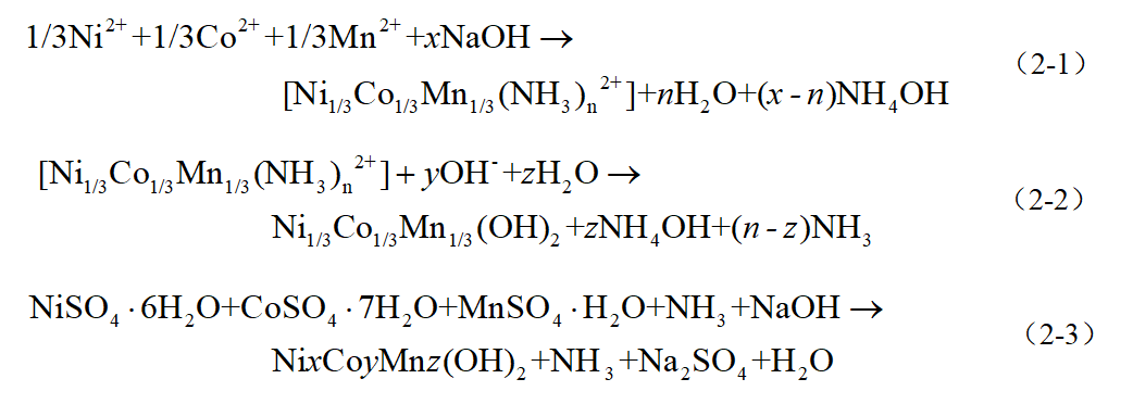不同金属离子在水溶液中发生共沉淀,必须满足一定热力学要求与动力学要求,沉淀的生成则可利用溶液积通过化学平衡理论来讨论。例如:盐溶液摩尔数=盐溶液摩尔量×盐溶液浓度体积(2mol/L×675mL=1.35mol),(Ni、Co、Mn)摩尔量=盐溶液摩尔量×(Ni、Co、Mn)所占比例。