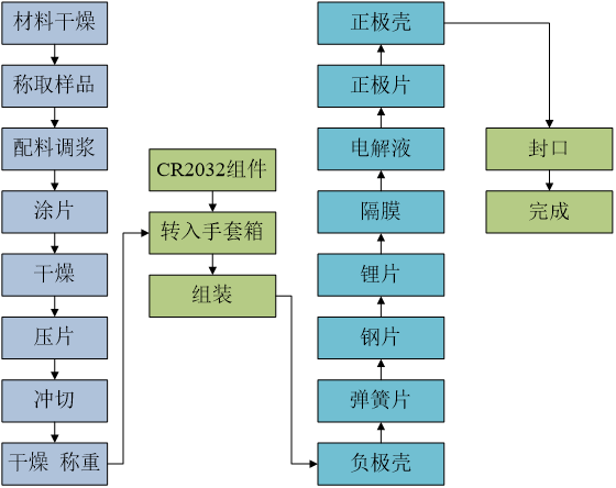 通过模拟调浆、极片制备、电池装配和封口等操作让实验者真实、准确的掌握纽扣电池的装配工艺,然后通过XPS和FE-SEM对制备三元电极材料进行化学分析、和形貌分析。通过和蓝电测试系统等对制备以三元电极材料为正极的电池的充放电比容量、循环稳定性能、充放电过程中离子电子的运动过程进行表征。其电池装配流程如图2-5所示。