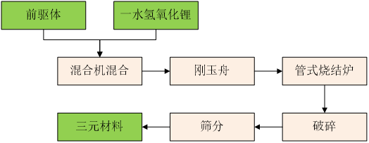 三元材料高温锂化过程包括锂盐和预制备前驱体的热分解,以及分解产物的化学反应过程,通过控制锂盐配比、煅烧温度、煅烧时间、氧气气氛等工艺参数制备目标产物,并通过化学及形貌分析制备符合要求的三元材料。